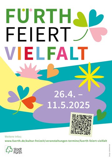 Das Festival “Fürth feiert Vielfalt“ lädt auch 2026 wieder ein, gemeinsam ein Zeichen zu setzen für mehr Inklusion, Bildungsgerechtigkeit und Vielfalt. Alle Bildungs-, Kultureinrichtungen und Kulturschaffende sind dabei aufgerufen, gemeinsam ein starkes Zeichen für Offenheit, Teilhabe und demokratischen Zusammenhalt in der Kleeblattstadt zu setzen. Initiiert vom Arbeitskreis Inklusion, unterstützt durch städtische Gremien und unter Schirmherrschaft von Oberbürgermeister Thomas Jung, macht das Festival sichtbar, wie bunt und vielfältig Fürth ist.