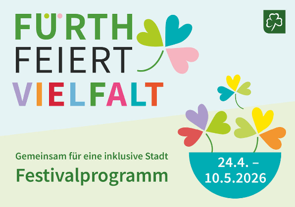 Das Festival FÜRTH FEIERT VIELFALT lädt auch 2026 wieder ein, gemeinsam ein Zeichen zu setzen für mehr Inklusion, Bildungsgerechtigkeit und Vielfalt. Von Freitag, 24. April, bis Sonntag, 10. Mai finden insgesamt fast 100 Einzelveranstaltungen statt, die ein starkes Zeichen für Offenheit, Teilhabe und demokratischen Zusammenhalt in der Kleeblattstadt setzen. Initiiert vom Arbeitskreis Inklusion, unterstützt durch städtische Gremien und unter Schirmherrschaft von Oberbürgermeister Thomas Jung, macht das Festival sichtbar, wie bunt und vielfältig Fürth ist. Von Workshops über Ausstellungen bis hin zu Mitmachaktionen oder Konzerten finden Sie alle Angebote in unserem Programmheft. FÜRTH FEIERT VIELFALT steht für Offenheit. Für ein Fürth für Alle, unabhängig von Alter, Geschlecht, Herkunft, Einkommen; Behinderung oder sexueller Orientierung.