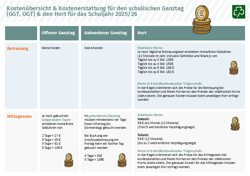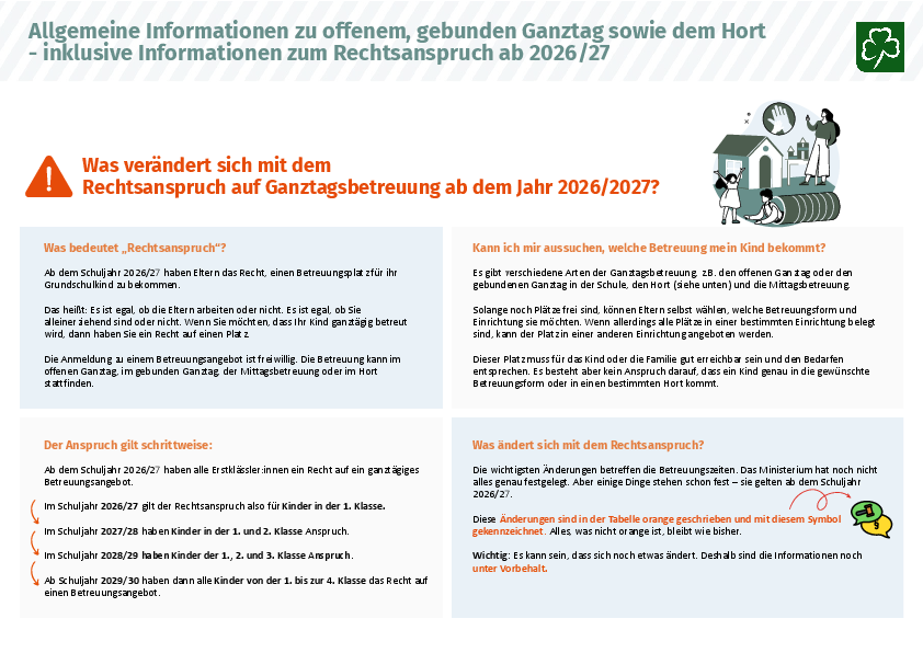 Hier finden Sie alle wichtigen Informationen zur Nachmittags-Betreuung nach der Schule für die Grundschule (1.-4. Klasse). Zum Beispiel: Welche Betreuungen gibt es an welcher Schule? Wo findet die Betreuung statt? Wie lange geht die Betreuung? Was muss ich bezahlen? Wo gibt es Hilfe, wenn ich mir die Kosten nicht leisten kann? Gibt es eine Ferienbetreuung? Gibt es ein Mittagessen? Wann kann ich mein Kind abholen? An welcher Schule gibt es welche Betreuung? Diese und viele andere Informationen finden Sie hier. Es gibt 4 PDF-Dateien. Sie können Sie herunterladen und auf Ihrem Smartphone oder Computer lesen.
