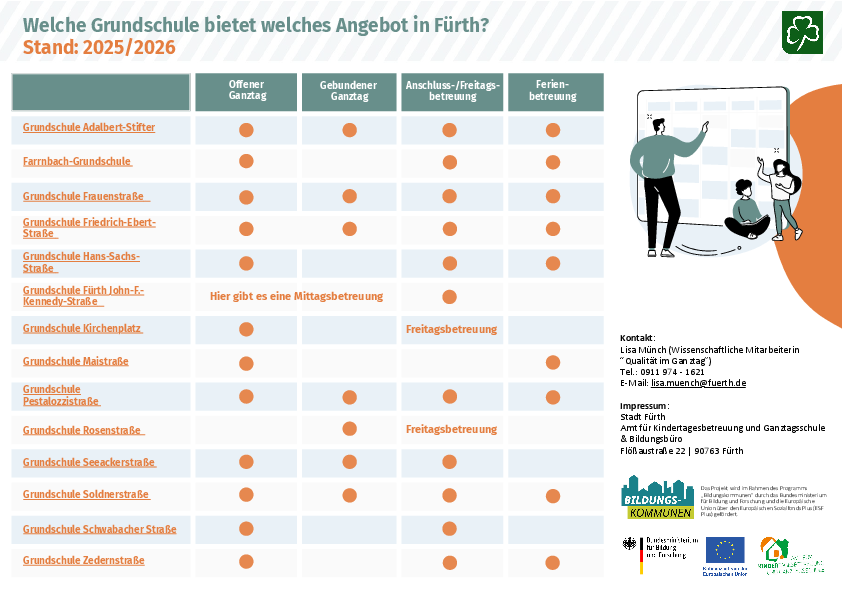 Zusätzlich haben wir Ihnen Informationen, Zahlen und interaktive Karten zusammengestellt. Das finden Sie auf dieser Seite. Sie erhalten Wissen, wie es um den Ausbau der Ganztagsangebote in Fürth steht, wie die Betreuungsquoten pro Schulsprengel verteilt sind, oder ob es einen Zusammenhang zwischen sozialer Lage und Betreuungsplätzen gibt.