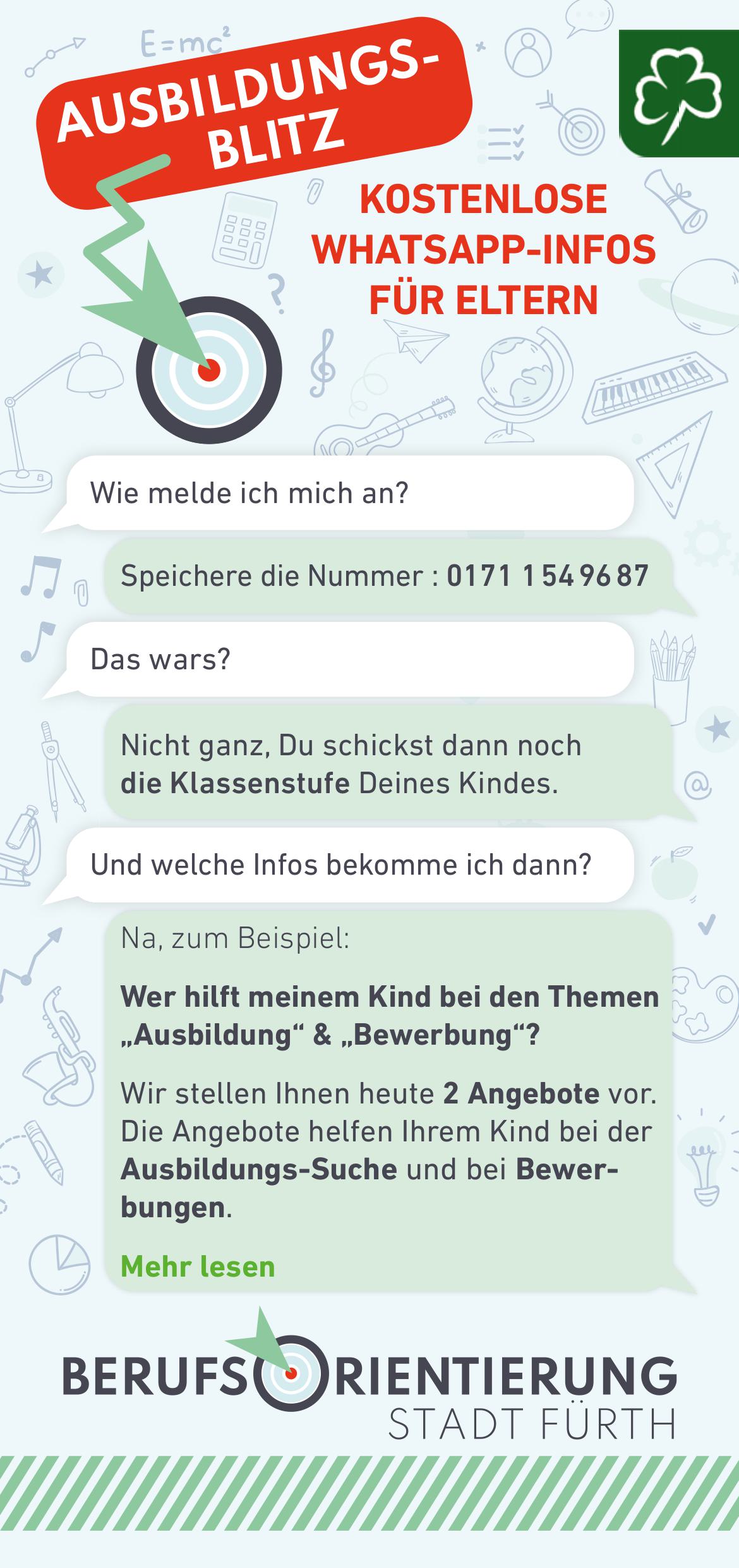Zukunft? Läuft bei uns! Wann und wo sind Ausbildungs-Messen? Wer hilft bei Bewerbung schreiben? Welche Berufe werden an Schulen ausgebildet? Welche Berufe gehen ohne Quali? Der Ausbildungsblitz ist der neue Whats-App-Broadcast für Eltern (Mittelschule)