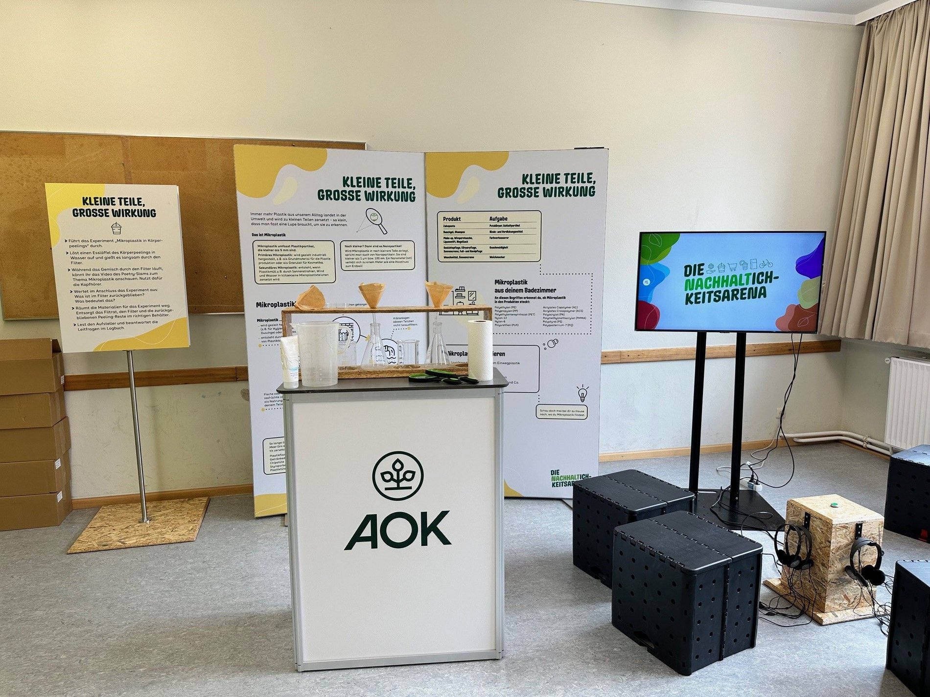Die Ausstellung „NachhaltICHkeitsarena“ der AOK Bayern – Die Gesundheitskasse macht Station im Waldhaus! In fächerübergreifenden Modulen werden zentrale Aspekte der Nachhaltigkeit vermittelt. Mit Aufgaben, Experimenten, Spielen, Filmbeiträgen und fundiertem Hintergrundwissen an interaktiven Ausstellungsmodulen werden die Schüler:innen zum selbstverantwortlichen Handeln angeregt und für eine gesunde, nachhaltige Lebensweise sensibilisiert. Die direkte Umsetzung der Inhalte im Alltag steht dabei im Mittelpunkt. Zur optimalen Vorbereitung steht den Lehrkräften ein Handbuch zur Verfügung, während die Schüler:innen den Ausstellungsbesuch mit einem Logbuch aktiv begleiten.